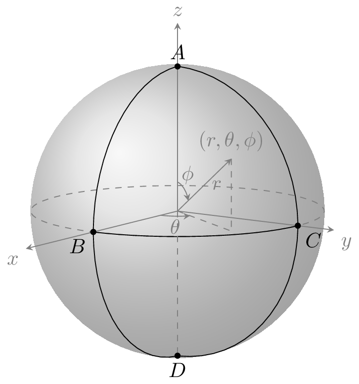 Alternatively, by embedding the sphere in $\mathbb{R}^{3}$, this is equivalent in Cartesian coordinates $(x,y,z)$ to $$A = (0,0,\frac{2}{\pi}), B = (\frac{2}{\pi},0,0), C = (0,\frac{2}{\pi},0), D = (0,0,-\frac{2}{\pi}).$$